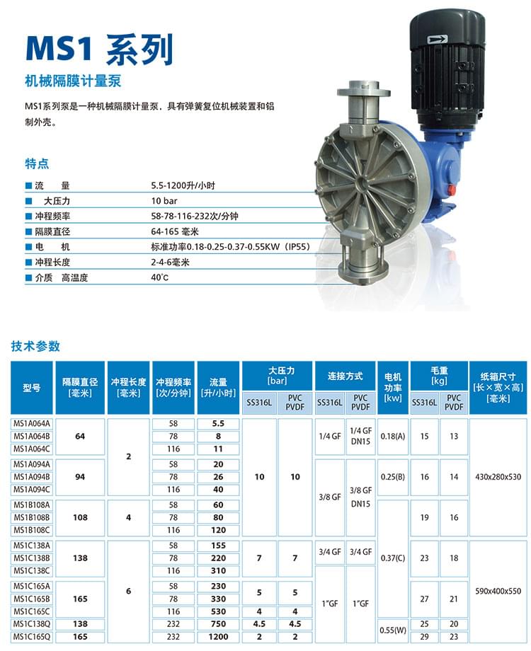 MS1系列泵是一種機械隔膜計量泵,具有彈簧復位機械裝置和鋁制外殼。