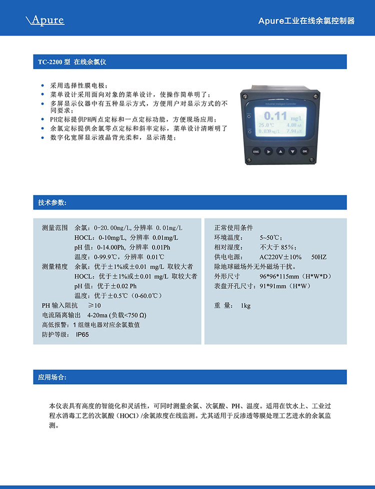Apure愛普爾余氯儀TC-2200工程在線極譜式余氯溫度PH測量控制器
